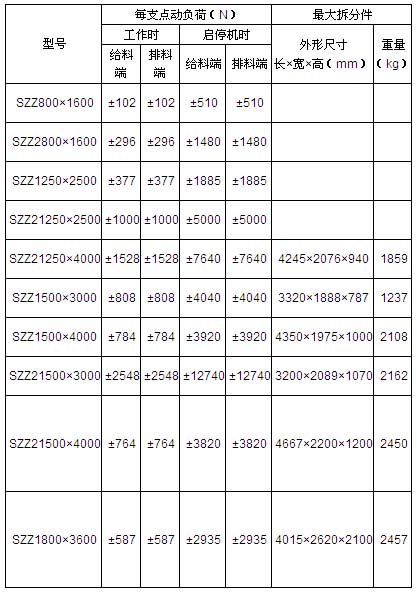 注:表中處理量是依據松散密度0.9t/m3的煤,按上層篩面大和小篩孔進行干式分級給定的,物料中小于篩孔尺寸之半的顆粒含量占40%,大于篩孔尺寸的顆粒含量占25%,篩分效率為90%。表中凡重量低于2t的篩機大拆分件均沒列出。